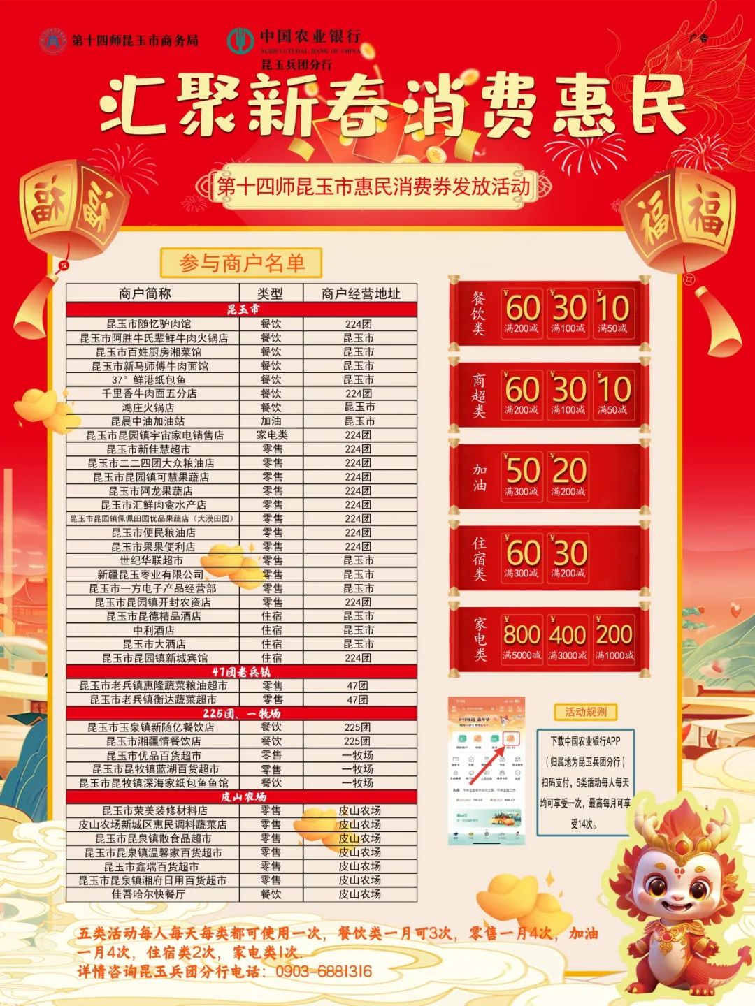 参与方式:下载中国农业银行APP(归属地为昆玉兵团分行),到参与活动的商家扫码支付,直接参与满减,5类活动每人每天均可享受1次,最高每月可享受14次。(其中餐饮类3次、零售类4次、加油类4次、住宿类2次、家电类1次,优惠券先到先得,领完为止。)