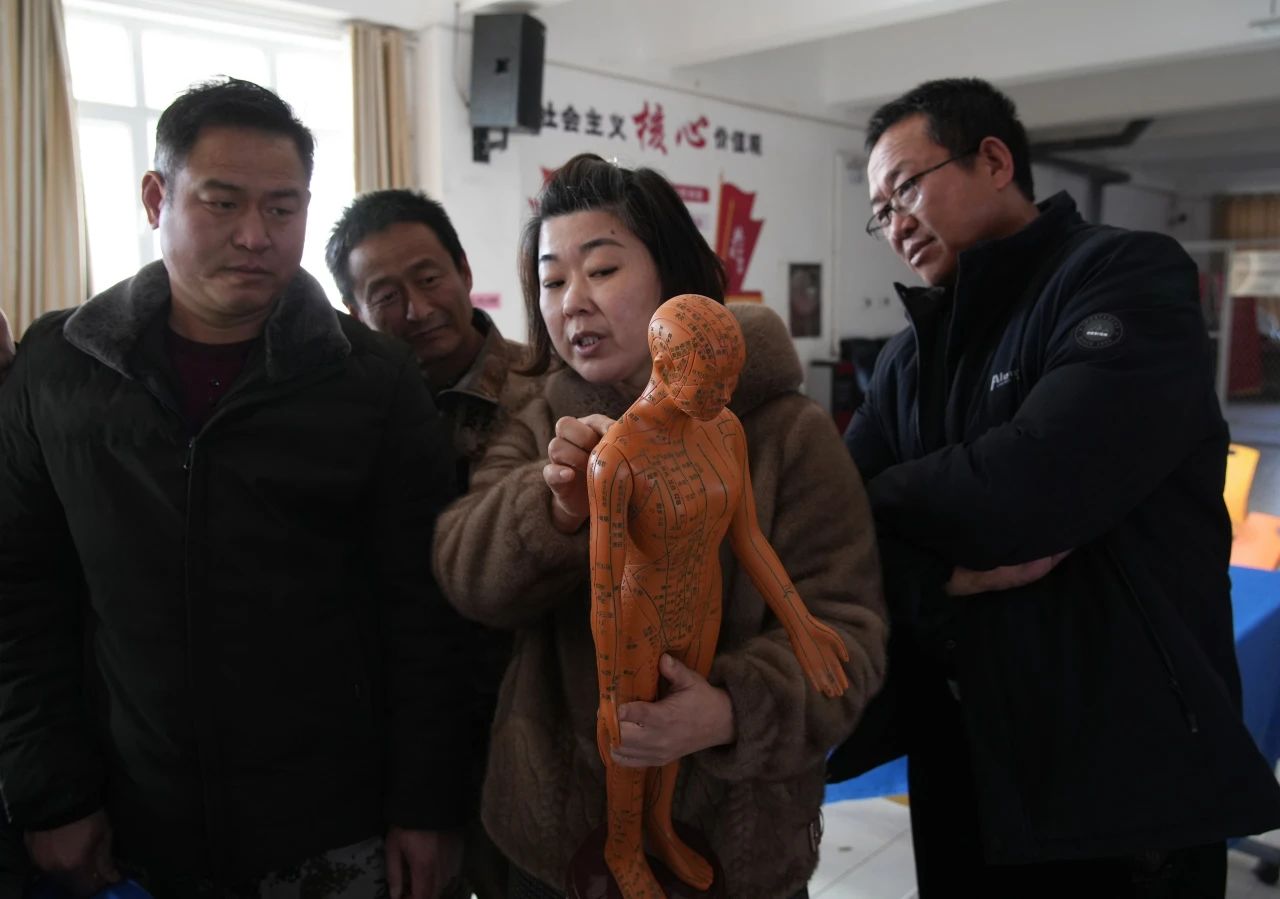 胡萍用人体模型为学员讲解人体构造,演示按摩部位及按摩手法。师市融媒体中心通讯员 陈欢 摄