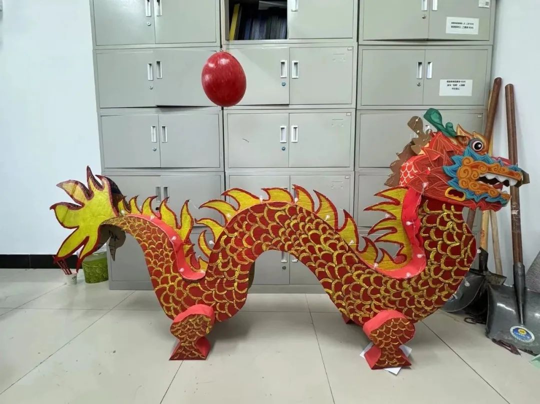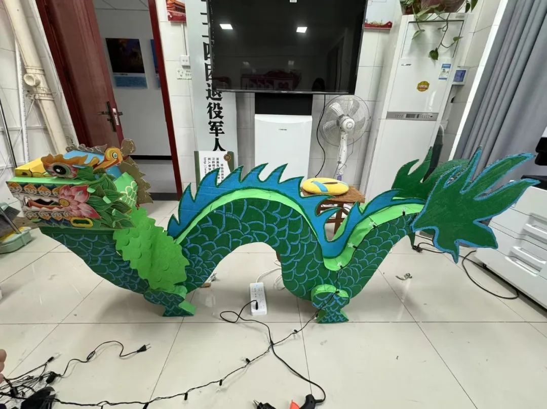 二二四团社服中心的双龙戏珠花灯让人眼前一亮。“因为今年是龙年,为契合龙年主题,我们以龙为主题,做了双龙戏珠的花灯。灯笼单个龙高1米,长2.5米,宽20厘米,一个龙以红色为主题,一个以绿色为主题,两个龙的颜色交相呼应,同时代表着新的一年我们有着喜庆丰收、祈求吉祥的美好愿望。”二二四团社服中心工作人员陈千禧介绍说。