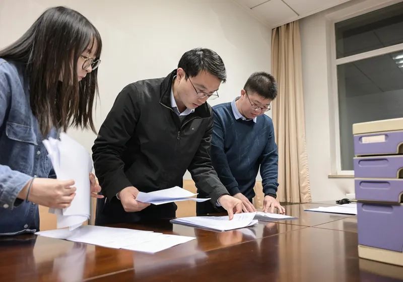 3月5日,在国务院办公厅的一间办公室内,接收分办组的工作人员整理从会场收集的意见建议材料。新华社记者 李贺 摄