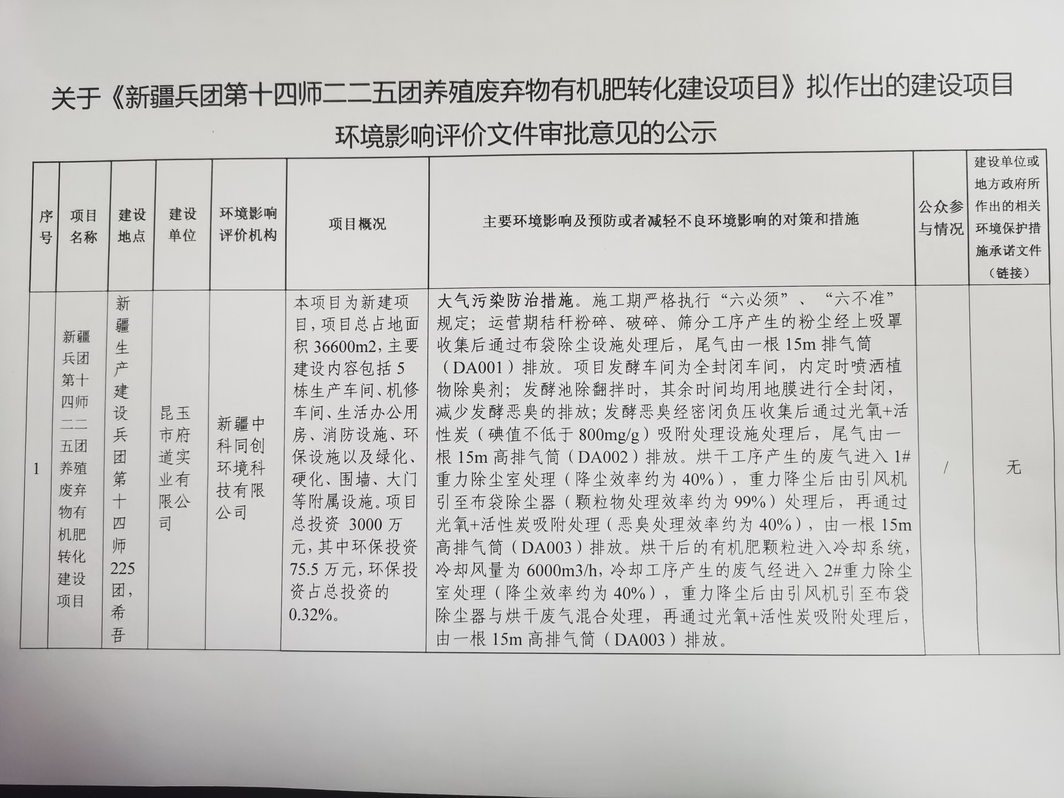 关于《新疆兵团第十四师二二五团养殖废弃物有机肥转化建设项目》拟作出的建设项目环境影响评价文件审批意见的公示