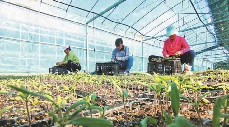 4月15日,六师新湖农场昕望农业开发专业合作社温室大棚内,种植户将培育好的番茄苗装进育苗穴盘准备出售。截至目前,新湖农场共建成95座温室大棚,今年一季度实现产值近460万元。杨强 陈瑞 摄
