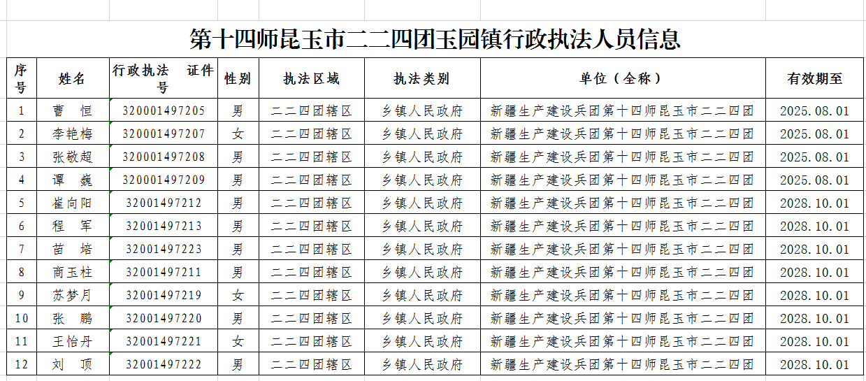 第十四师昆玉市二二四团玉园镇行政执法人员信息(2024年4月)