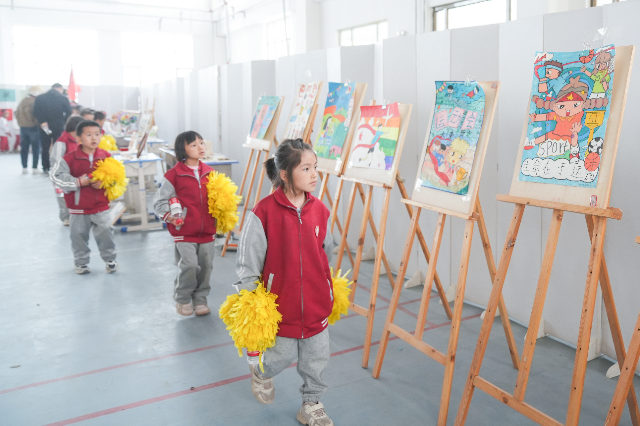 同时,学校在体育馆开展“弘扬红色文化·传承老兵精神”主题展,展示了众多描绘红色文化元素的绘画、书法和手工制品。学生们有序参观,仔细欣赏着这一件件精美的作品,感悟红色文化的魅力。