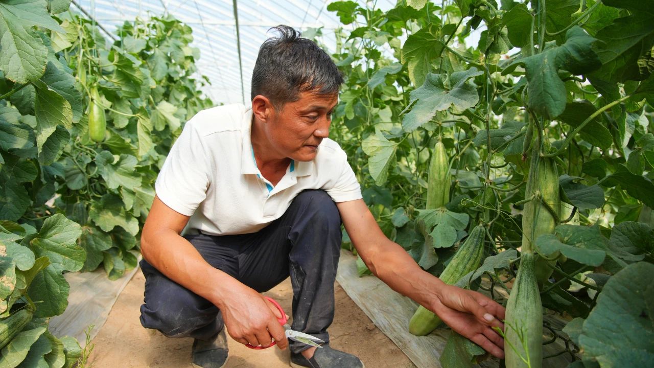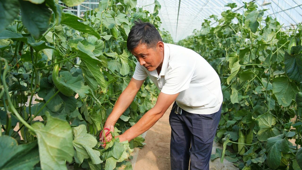 走进二二四团昆玉田穆园,只见一座座温室大棚排列整齐,棚内生机盎然,各类果蔬长势正旺,已陆续进入采摘期。在大棚承包种植户刘国峰的大棚里,一排排郁郁葱葱的藤蔓上,挂满了沉甸甸的甜瓜。他正在为即将采摘的甜瓜掐尖,四座大棚给他带来了十分可观的收入。