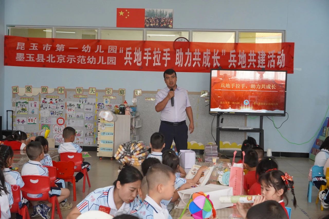 5月24日,昆玉市第一幼儿园的老师和孩子们走进墨玉县北京示范幼儿园,共同开展“兵地手拉手 助力共成长”兵地共建活动。