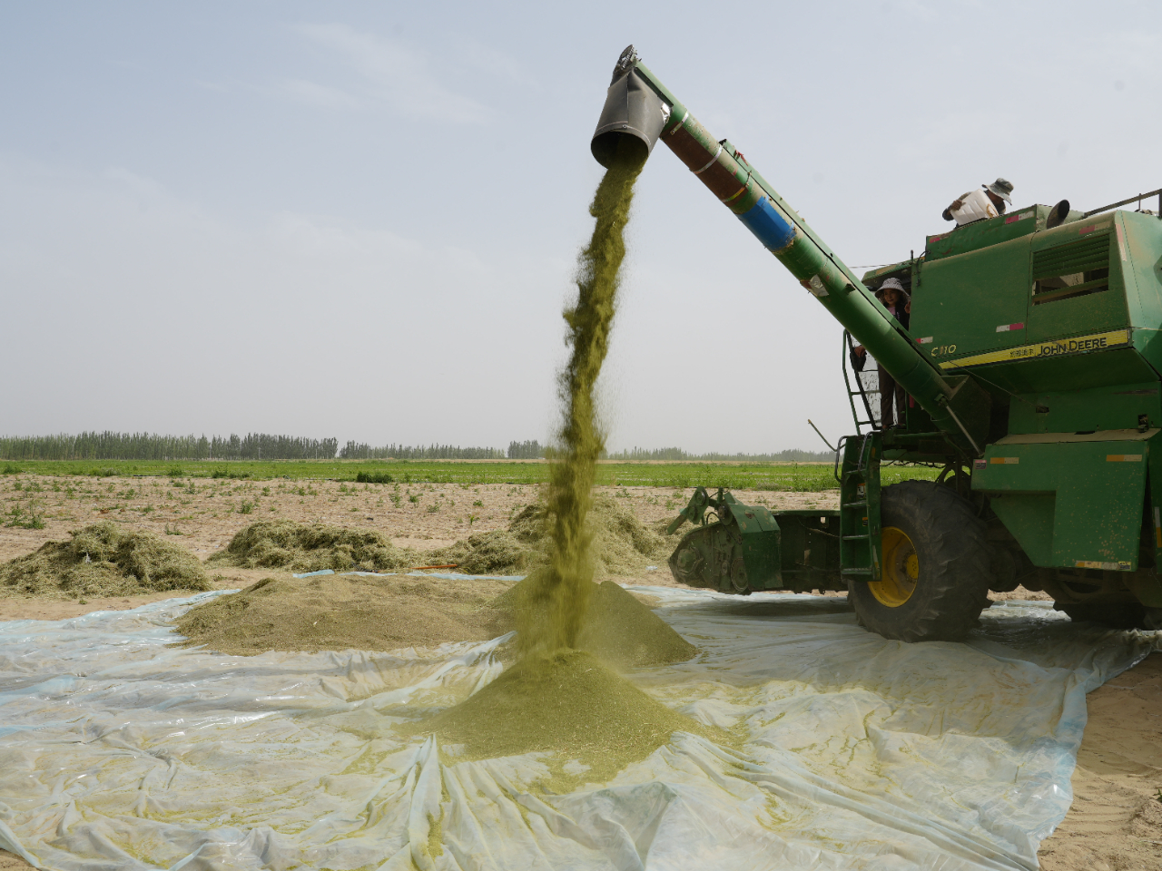 6月11日,在二二五团三连种植户托合提苏来曼·艾买尔的孜然地里,金黄色的孜然籽粒饱满、香味十足,几十名工人正忙着抢抓时机,进行孜然的采收、晾晒和脱粒等工作。