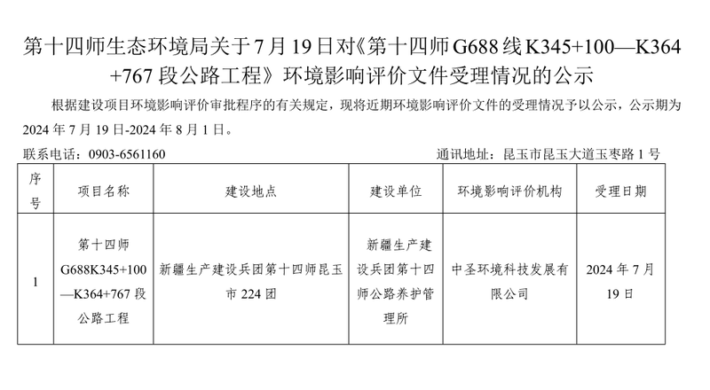 第十四师生态环境局关于7月19日对《第十四师G688线K345+100—K364+767段公路工程》环境影响评价文件受理情况的公示