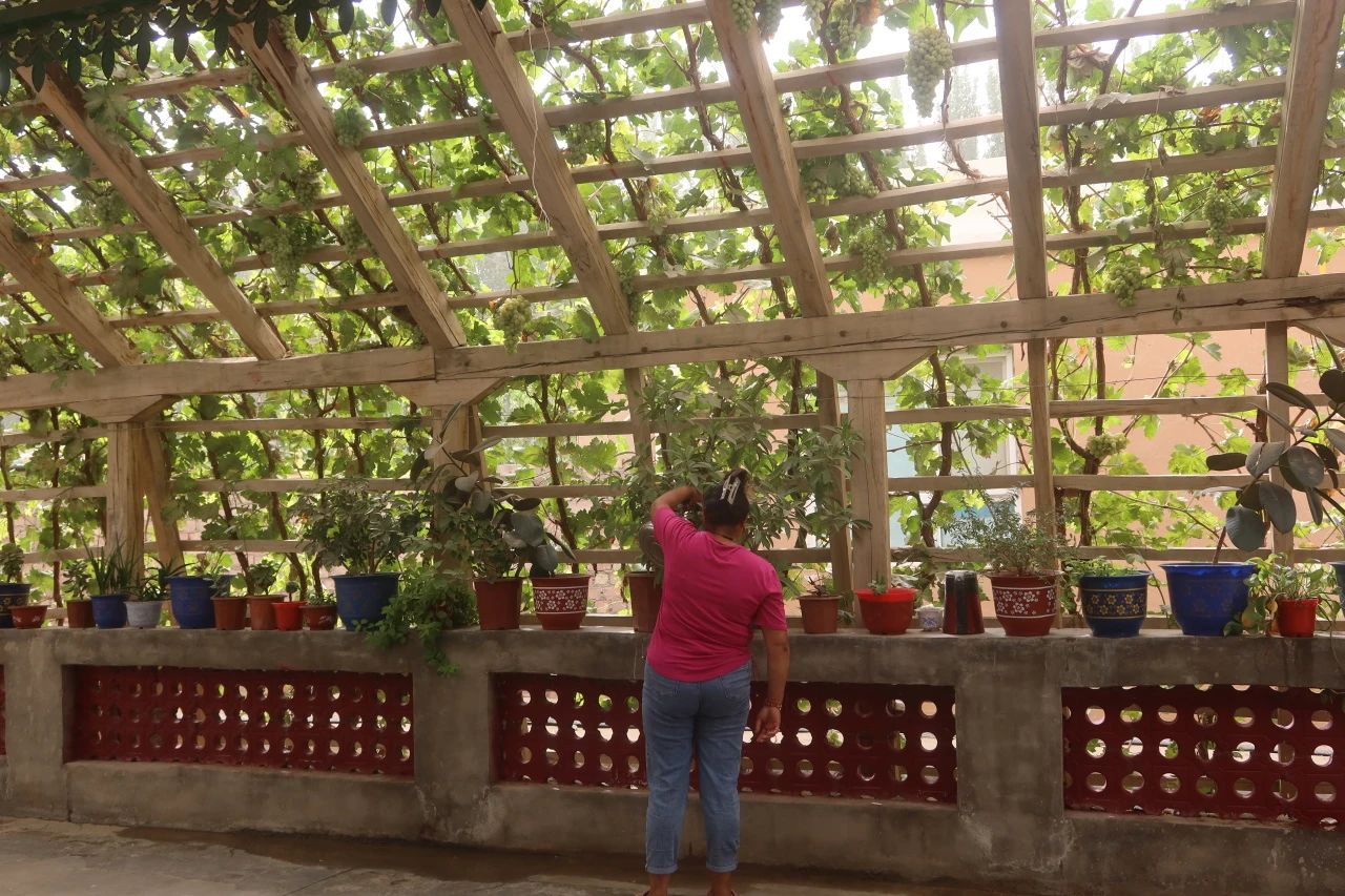 绿化管护也是该连队人居环境整治的一部分。这几日,十一连居民阿卜力米提·图地刚刚把庭院葡萄架上的葡萄修剪完,一串串翠绿的葡萄香甜诱人。在庭院的一角,是一小片菜地,菜地被收拾得清清爽爽,又长又绿的辣椒挂满枝头。