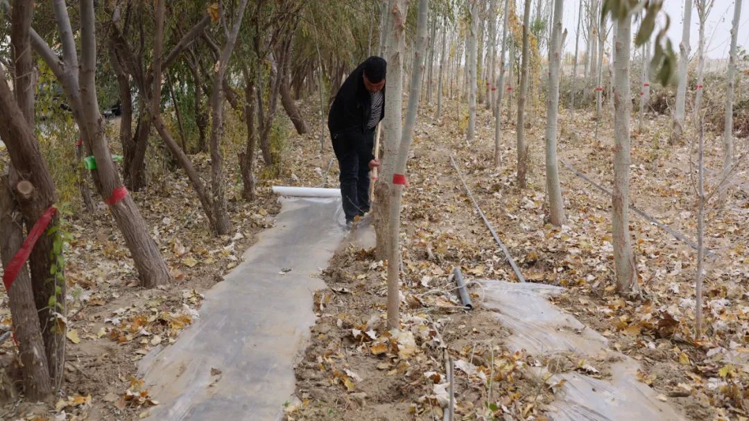 道路两侧,种植牡丹的工作人员正忙碌着为种好的牡丹覆膜