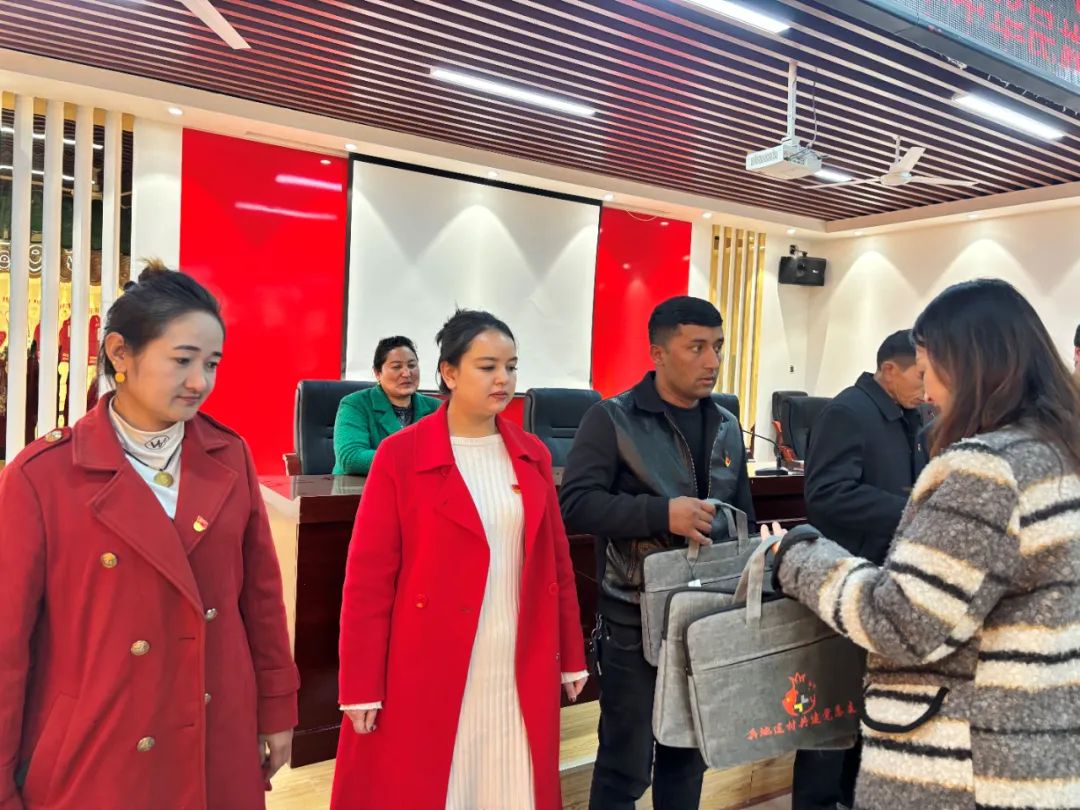 活动最后,二连党支部分别向三个共建单位赠送具有兵地共建党建标识的公文包。该标识设计巧妙,以“古连依”的英文字母“G、L、Y”为基础,以红色、黄色、蓝色为主色调。其中,红色、黄色与蓝色分别代表二连、羌古村与墩加依村,共同构成一个石榴造型,寓意各民族像石榴籽一样紧紧拥抱在一起。