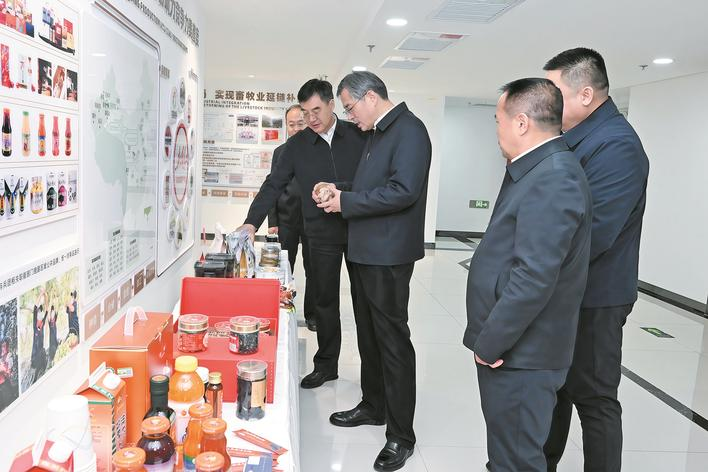 11月26日,自治区党委副书记、兵团党委书记、政委何忠友在兵团部分国有企业调研。这是何忠友走进新疆中新建农牧有限责任公司展厅,察看陈列产品,听取企业经营管理等情况介绍。兵团日报全媒体记者 张鑫 摄
