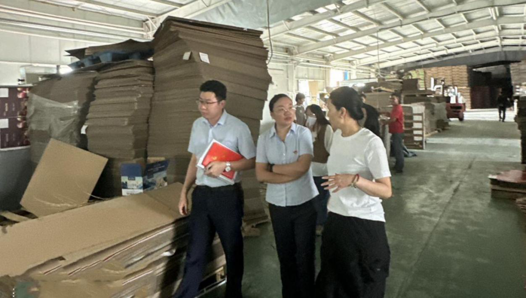 阿克苏塔里木农商银行客户经理在阿克苏市知之纸箱包装厂走访调研。唐轲摄