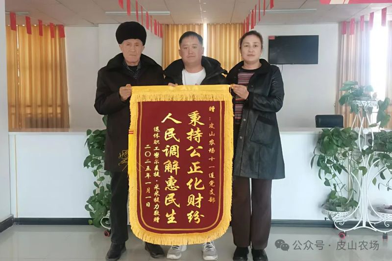 “请一定收下这面锦旗,感谢你,感谢连队······”1月19日,经过四五次的电话联系,十一连退休职工努尔麦提·米米提力终于将早已做好的锦旗送达十一连,锦旗上端正书写着“人民调解惠民生 秉持公正化财纷”十四个大字,表达了努尔麦提对布坚乃提·阿卜拉和十一连党支部为他讨回欠款的衷心感谢。