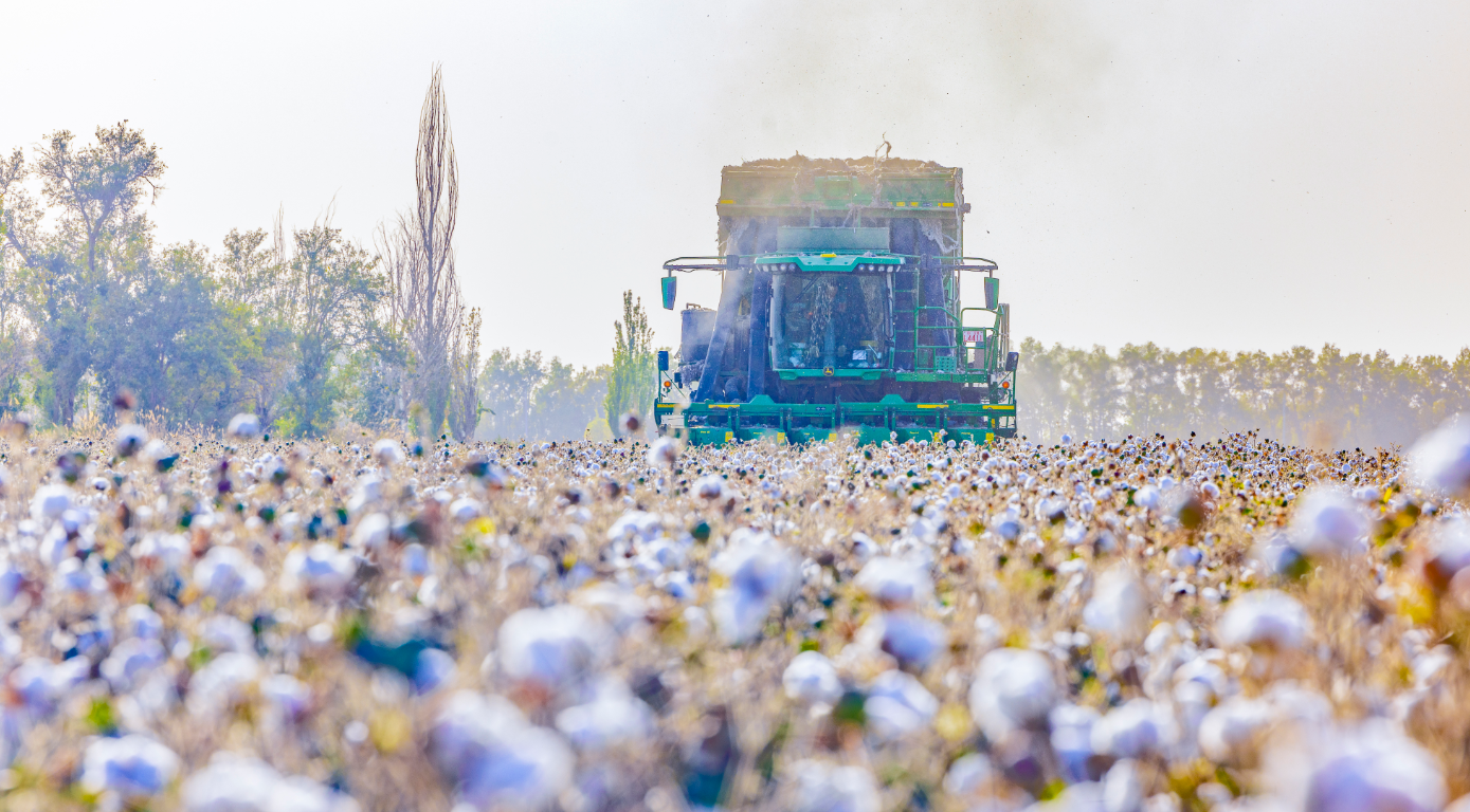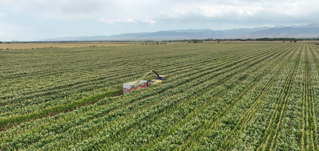 新疆创锦农牧业有限公司饲草料种植基地,收割机在田间作业。来源:新疆创锦农牧业有限公司