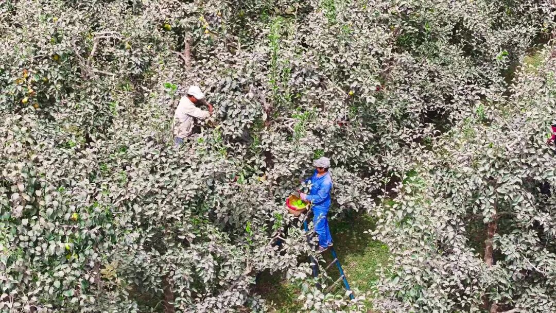 在一师九团梨花镇十五连的一片果园里,工人采摘香梨。阿迪力·艾尼 摄