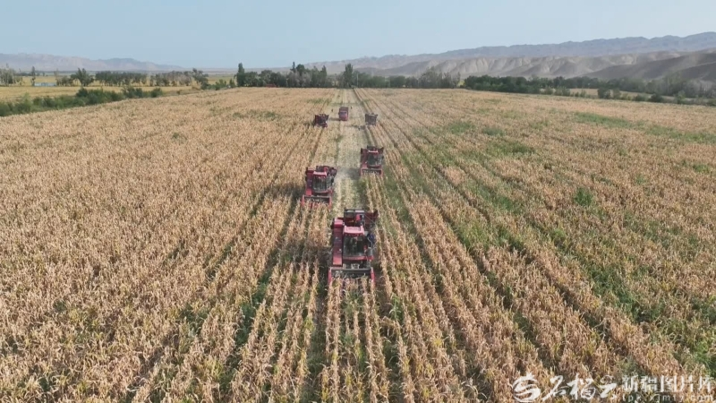 9月末,玛纳斯县包家店镇的制种玉米地里,农机来回穿梭收割玉米,一派繁忙的秋收景象。图/玛纳斯县融媒体中心提供