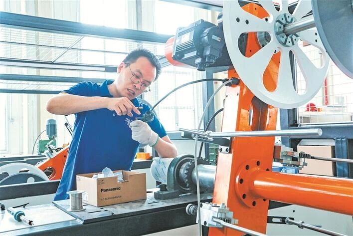 在新疆瑞辰伟业智能装备有限公司组装车间,工人进行内镶贴片式滴灌带自动化设备组装作业(资料图片)。该公司是一家集设计研发、生产、销售、服务于一体的智能装备制造企业,依托二师铁门关市丰富的农业资源和地缘优势,通过技术创新,提升当地农业生产效率与水资源可持续利用水平。 兵团日报常驻记者 魏承亿 摄