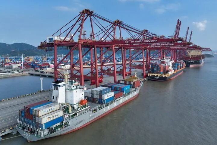 (一)东海之滨,宁波舟山港,岸线上靠满万吨巨轮,桥吊装卸不停。截至9月11日,港口今年集装箱吞吐量突破3000万标准箱,较去年提前23天,再次刷新历史纪录。