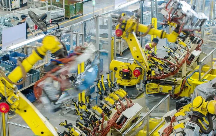 2025年10月9日,浙江省湖州市长兴经济技术开发区的长兴地通汽车部件有限公司技术人员操控工业机器人生产新能源汽车配件(无人机照片)。 新华社发(谭云俸 摄)