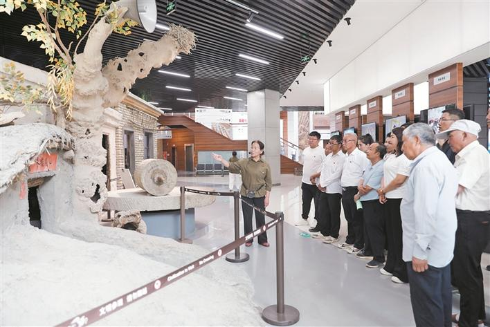 三五九旅屯垦纪念馆银发讲解员唐玉珍(左一)向游客介绍军垦战士住的地窝子(资料图片)。兵团日报常驻记者 潘许 摄