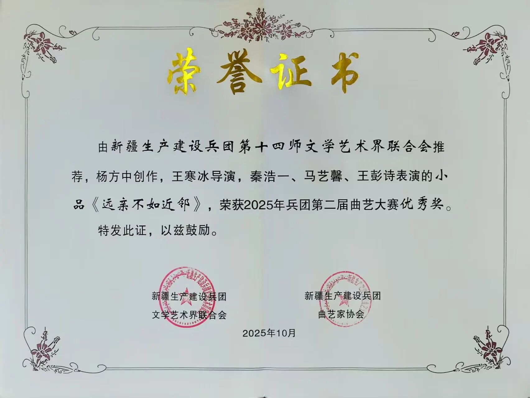 近日,兵团第二届曲艺大赛评选结果正式公布,由师市文联选送的小品《远亲不如近邻》荣获优秀奖。