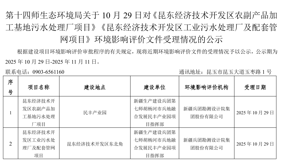 第十四师生态环境局关于10月29日对《昆东经济技术开发区农副产品加工基地污水处理厂项目》《昆东经济技术开发区工业污水处理厂及配套管网项目》环境影响评价文件受理情况的公示