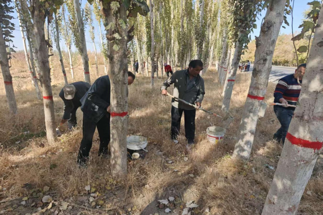活动现场,大家分工明确、默契协作:有人手提调配好的生石灰药剂桶,有人手持毛刷沿树干精准粉刷,严格按照“树干通直、统一高度、涂层均匀无流挂”的要求,对道路两侧树木逐一刷白。完成单株刷白作业后,工作人员同步修剪行道树枯枝、病枝,及时清理残枝落叶及周边杂物,真正实现“养护+保洁”一体推进。截至目前,已完成沿线3000余株树木刷白。换上洁白整齐“冬装”的树木,既让道路两侧景观更显清爽整洁,更以“防护+美化”双重效果,为团场勾勒出一幅干净宜居的生态画卷。