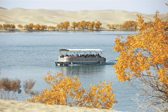 十四师一牧场的蓝湖生态园里层林尽染,绯红、明黄、赭石三色交织,缤纷色彩织就锦绣画卷,秋日最后的华章正上演着。远处,昆仑山脉的雪峰在阳光下熠熠生辉,以亘古不变的姿态守护着这片美丽的土地。