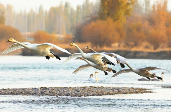 二师二十一团天鹅湾是候鸟迁徙的重要栖息地,天鹅嬉戏、胡杨金黄、湖水湛蓝,构成一幅灵动的生态画卷(摄于11月3日)。 白克斌 摄