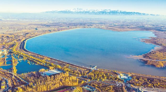 航拍视角下六师五家渠市青格达湖湖水澄澈如镜,与远处雄伟的博格达峰相映成景(摄于11月2日)。 李华北 摄