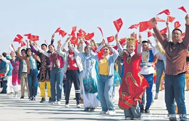 9月23日,自治区各族群众代表挥动红旗,热烈欢迎总书记的到来。石榴云/新疆日报记者 崔志坚摄