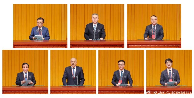 11月18日,在2025新商大会上,中国工程院院士彭苏萍、中国华电集团总经理叶向东、浙江恒逸集团总裁倪德锋、特变电工董事长张新、阿联酋中国新疆商会暨同乡会会长阿不来提·买买提、上海新疆商会会长韩宇泽发言。新商联盟主席杨剑发布联盟倡议(由上至下、由左到右)。石榴云/新疆日报记者 崔志坚摄