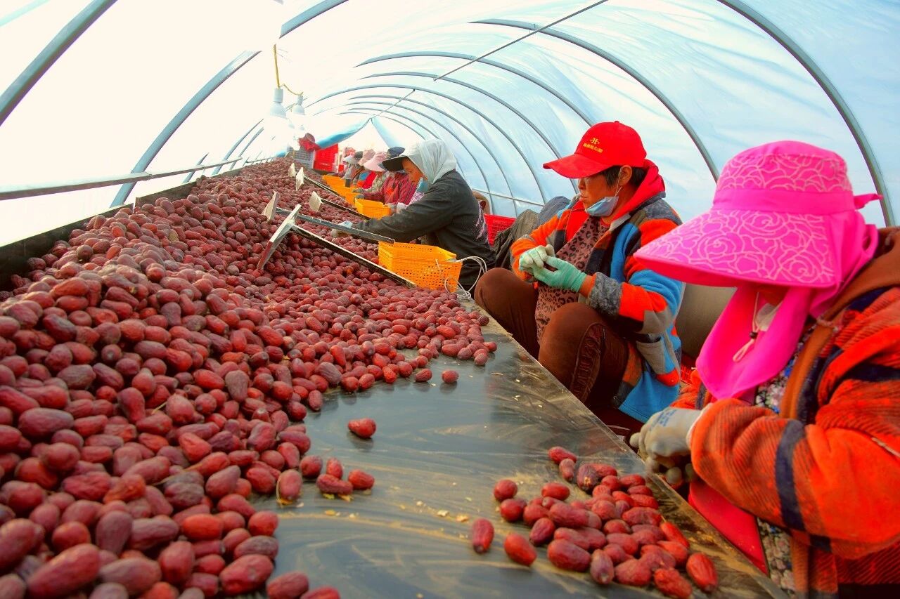 在分拣车间,机器的轰鸣与工人的笑语交织成另一番繁忙景象。刚从田间运来的红枣被送入分拣线,经过筛选分级、加工后,迅速被装袋、打包,即将通过物流发往全国各地。