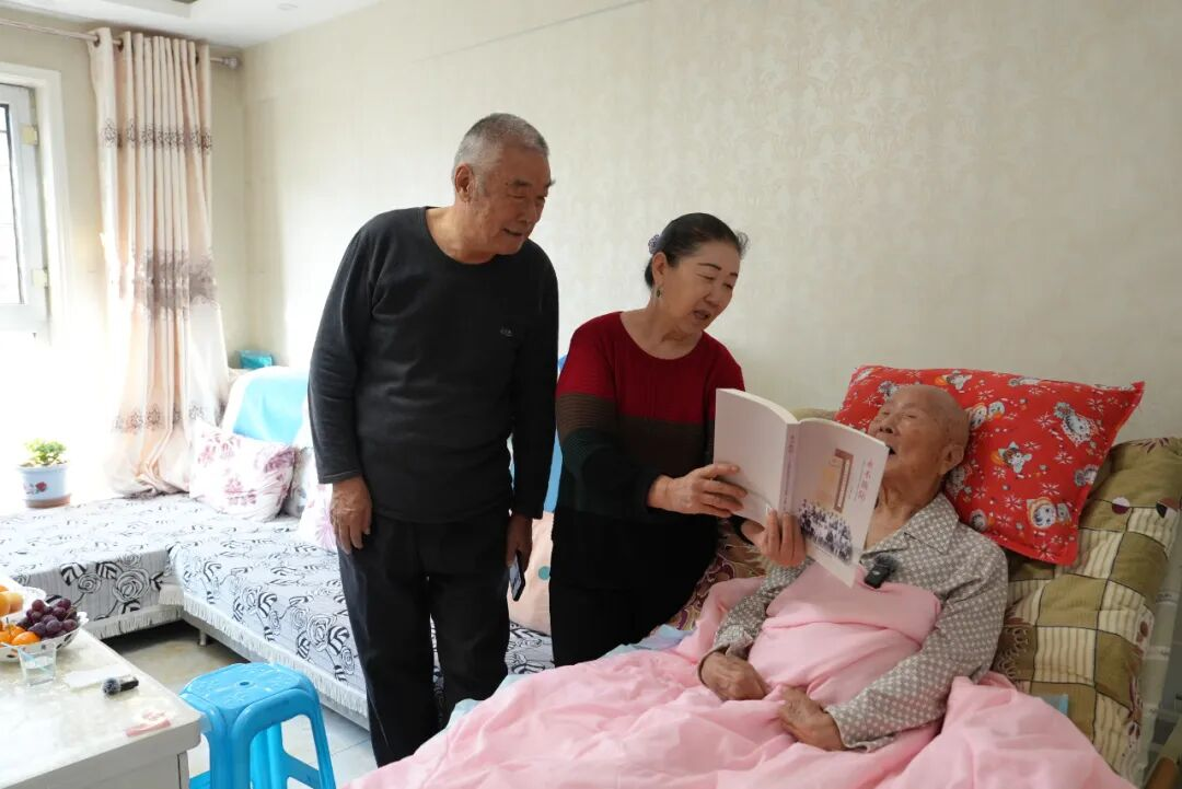 老战士杨世福与女儿、女婿一同看书 (胡凌 鲁源摄)