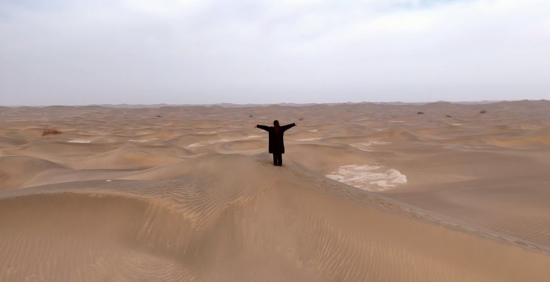 正午的沙海愈发壮阔,阳光将沙丘晒出金属般的质感,半流动的沙丘群在光影中变幻姿态,时而如凝固的浪涛,时而似舒展的绸缎。空气里浮动着干燥的沙土气息,远处的小沙包静静伫立,与蓝天构成简洁又磅礴的画卷。