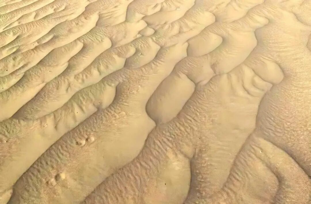晨光里的沙丘最是动人,向阳的棱线被镀上金边,背阴处仍浸在靛蓝的晨雾中。抓起一把细沙,指缝间竟流转着淡金、浅褐与微红的光泽,每一粒都藏着阳光的密码。风在沙面刻下细密波纹,那是它走过的签名,偶尔有沙蜥掠过,留下一串细碎足迹,转瞬又被流沙温柔抚平。