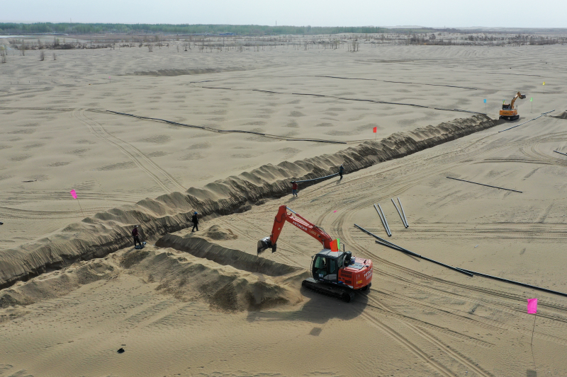 在新疆和田地区民丰县防沙治沙试验站,施工人员驾驶机械预埋输水管线(2025年4月8日摄,无人机照片)。新华社记者 丁磊 摄