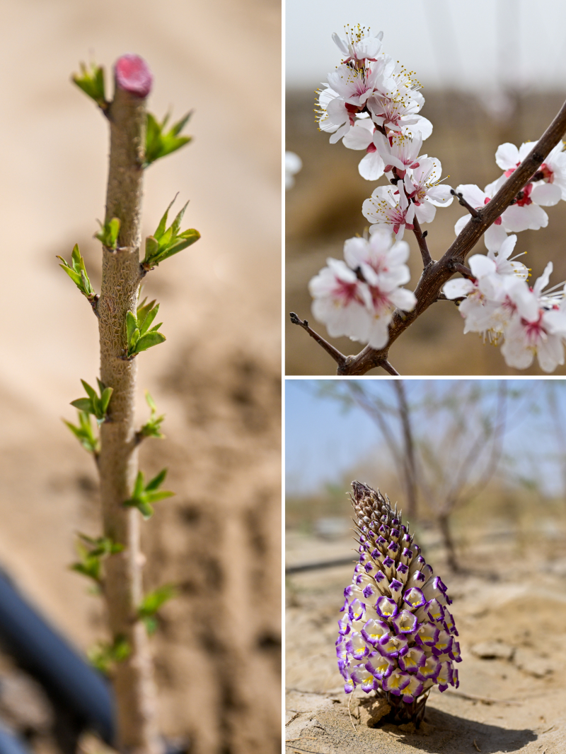 拼版照片:左图为新疆和田地区于田县阿热勒七仙女防沙治沙标杆项目区种植的玫瑰花苗(2025年4月8日摄);右上为新疆阿克苏地区拜城县万亩吊干杏种植基地内绽放的杏花(2025年4月12日摄);右下为新疆和田地区于田县阗东防沙治沙综合示范标杆区生长的肉苁蓉(2025年4月8日摄)。新华社记者 丁磊 摄