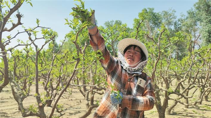 十四师二二四团八连职工给红枣树抹芽(摄于5月10日)。刘秋月 摄