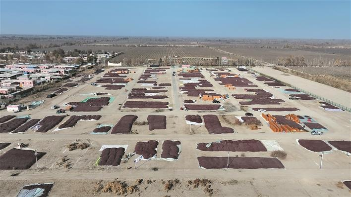 十四师二二四团玉园镇位于昆仑山下、塔克拉玛干沙漠南缘,种植近14万亩红枣,年产红枣数万吨,年产值突破8亿元,职均纯收入2.69万元,因发展红枣这一主导产业跻身“国家农业产业强镇”。昔日风沙肆虐的戈壁荒滩,如今化作一片“红色海洋”,一颗颗果肉饱满的红枣,成为职工群众增收致富的“红玛瑙”。