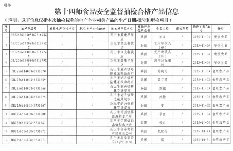 根据《关于印发<2025年兵团食品安全抽检监测工作计划>的通知》兵市监食发〔2025〕14号文件要求,近期,第十四师昆玉市市场监督管理局组织对辖区内餐饮食品、食用农产品等2大类食品进行监督抽检,现将具体抽检信息公告如下: