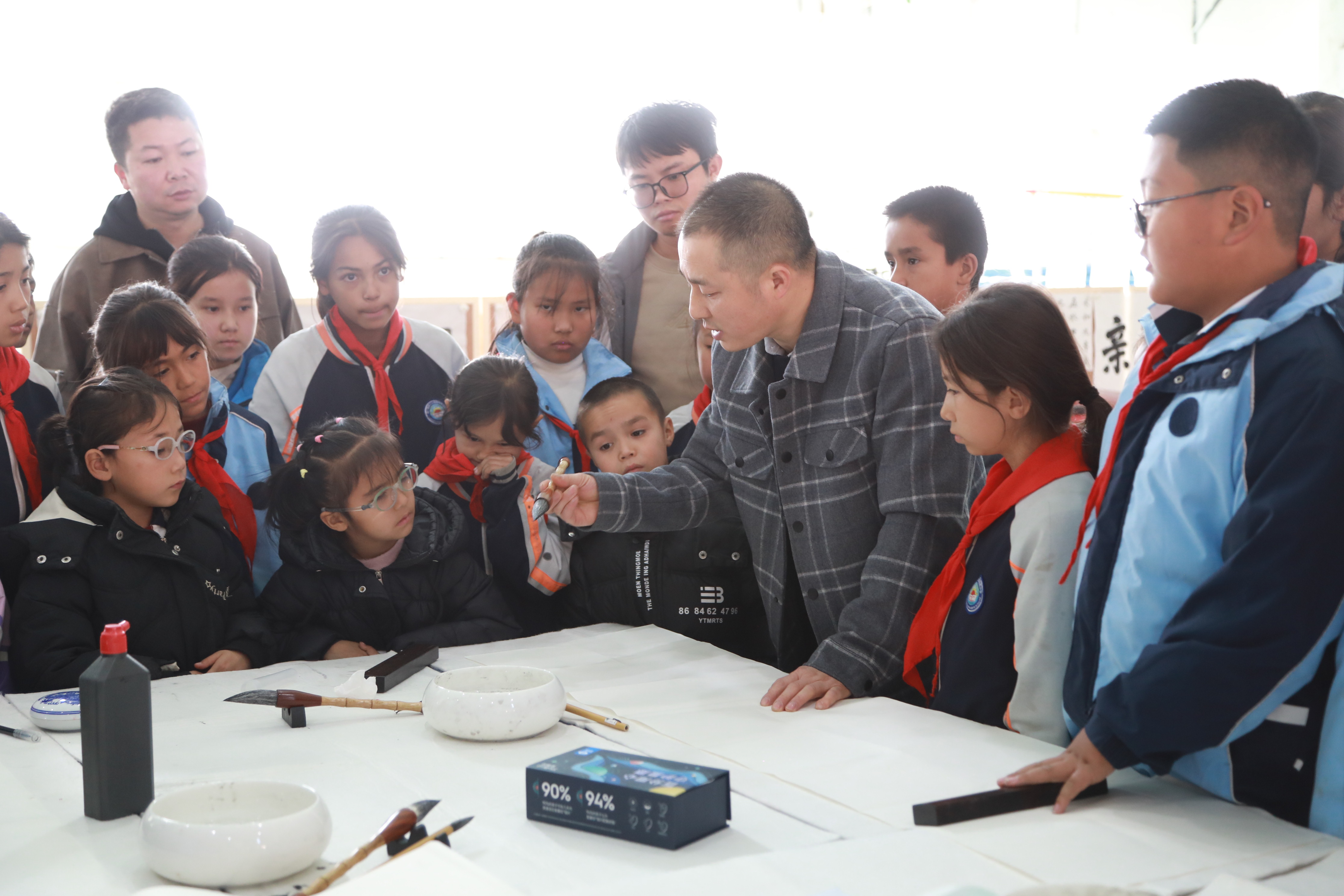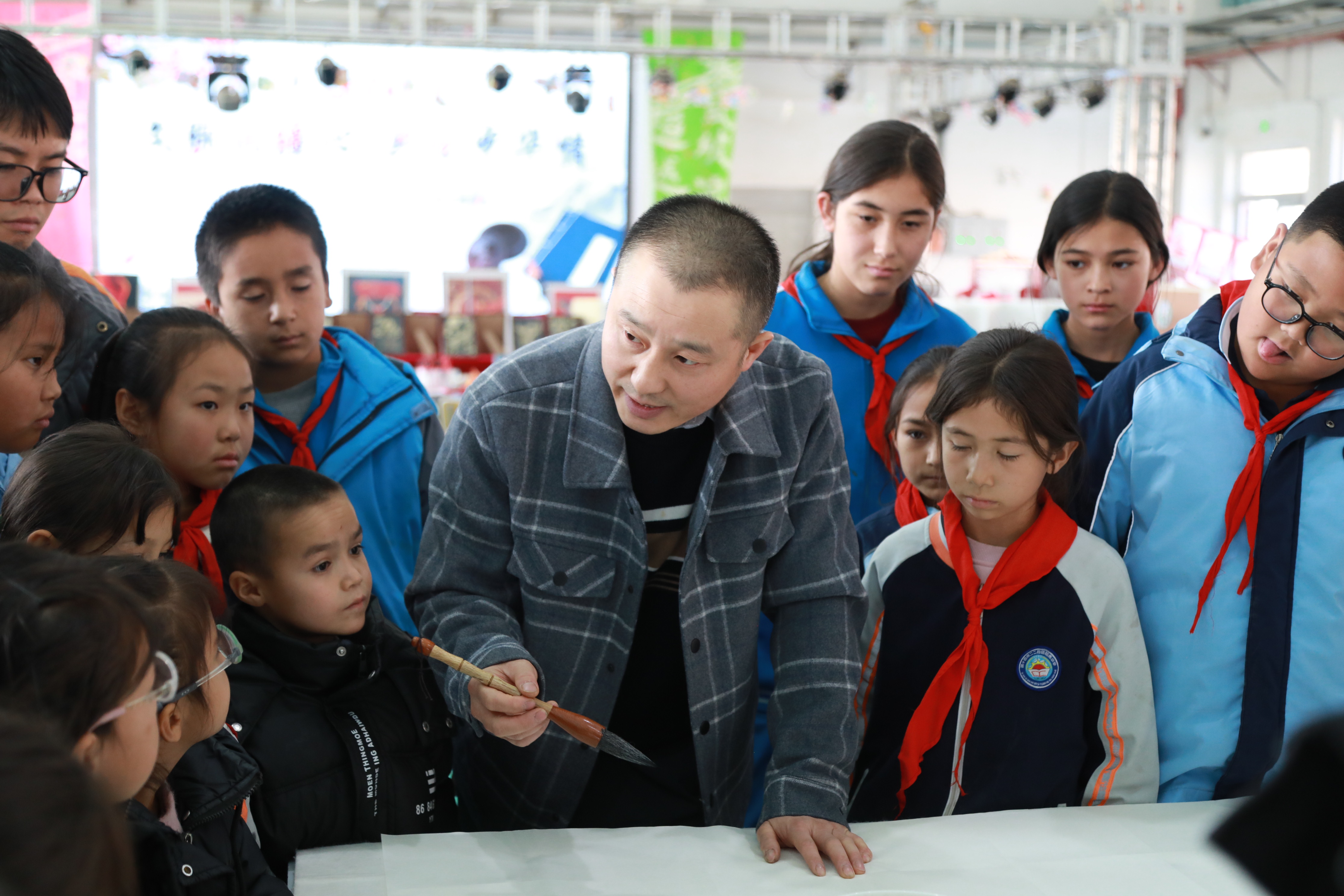 小学阶段是文化启蒙、价值观塑造的关键时期。李荣老师紧扣低年级学子的认知规律,以“趣味化启蒙+沉浸式体验”为核心,始终贯穿文化育人理念:“汉字是中华文明的载体,每一笔一画都承载着民族的历史记忆与精神密码。写好中国字,就是传承中华文化,就是在心中播下爱党爱国、认同民族的种子。”他俯身手把手指导每一位孩子,耐心纠正运笔偏差,鼓励孩子们在反复练习中感受汉字的形体之美与文化内涵。活动尾声,他挥毫写下“文化润疆”等作品,孩子们捧着墨宝,眼中闪烁着对传统文化的热爱与自豪,一颗颗文化自信的种子在童真心灵中悄然萌发。