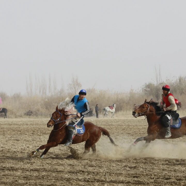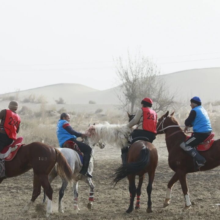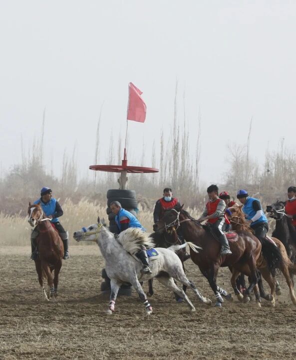 比赛现场,黄沙漫天 呐喊助威声此起彼伏 来自和田地区和第十四师昆玉市的 6支代表队100多名骑手轮番上场 他们身着民族盛装,跨上骏马 如同离弦之箭般在沙漠中疾驰 骑手们在马背上施展各种精湛技巧 时而俯身疾冲,时而翻身抢夺 比勇敢、赛骑术 相互配合,奋力争抢 场面十分激烈,引得观众阵阵欢呼。