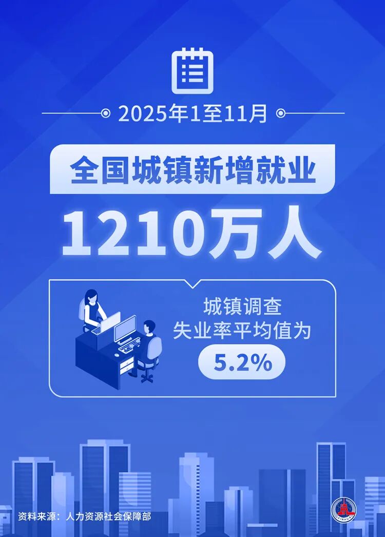 记者12月16日从人力资源社会保障部获悉,1至11月,全国城镇新增就业1210万人,城镇调查失业率平均值为5.2%。