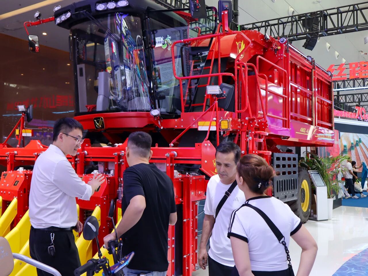 在2025(中国)亚欧商品贸易博览会新疆天鹅现代农业机械装备有限公司展台,公司相关负责人向客商介绍参展产品。 兵团日报全媒体记者 张美玲 摄
