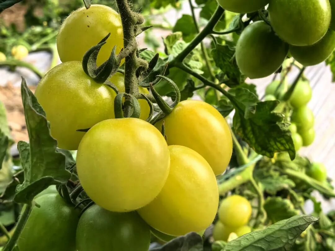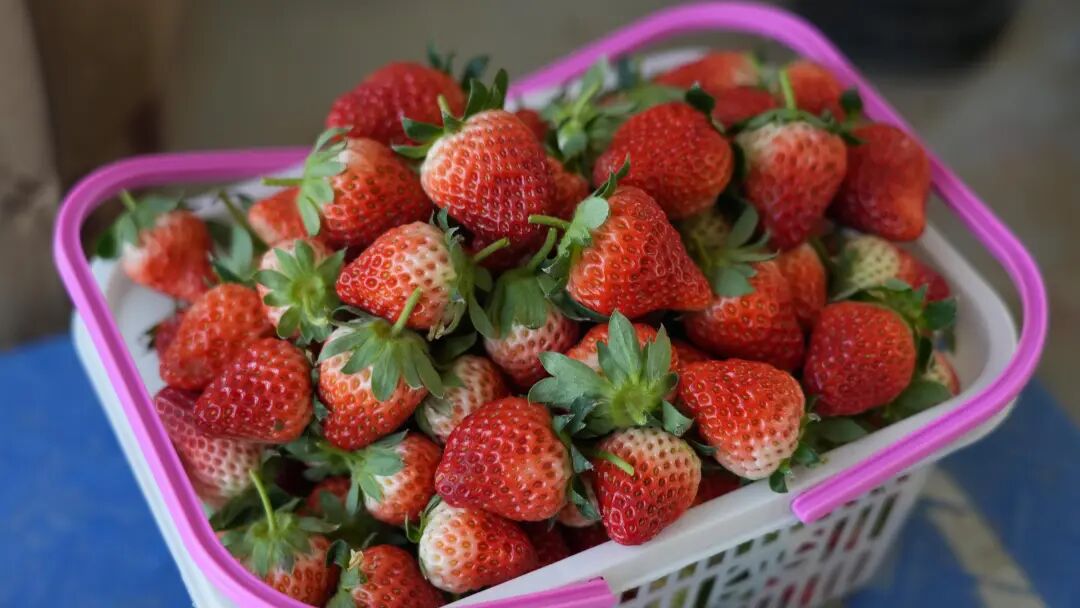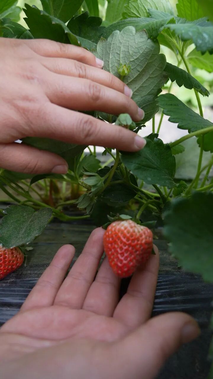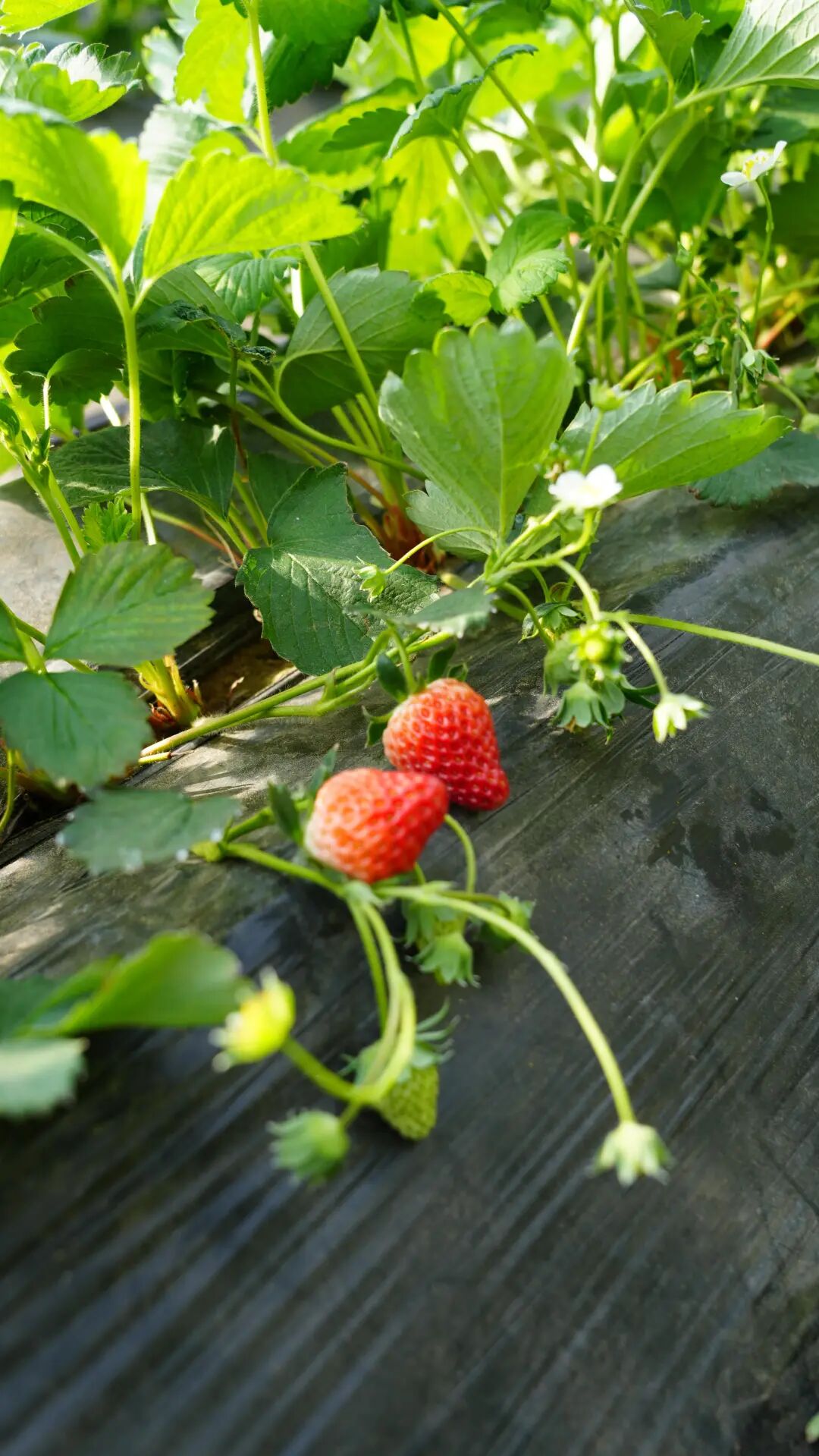 一颗颗饱满的奶油草莓掩映在绿叶之下