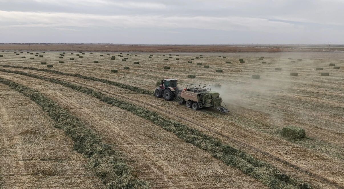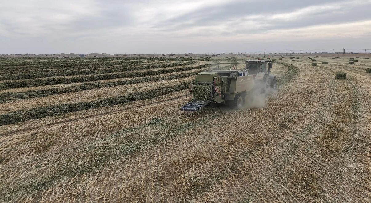 “这里种的燕麦草一年能收两茬,眼下是今年的第二茬收割。”国投集团种植团队工作人员郭嘉洲介绍,“从11月5日开始,收割持续了10天。经过约20天的晾晒后,这些燕麦草就能作为牛羊饲料。这一茬预计可收获干草约1100吨。”