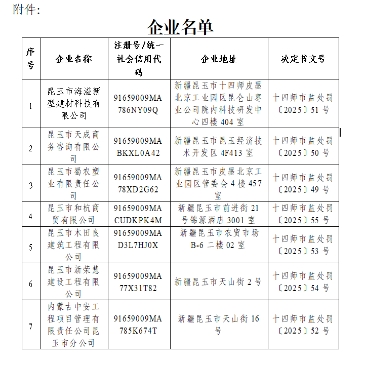 昆玉市海溢新型建材科技有限公司等7户企业: