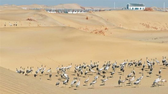 两年前,这里是一片茫茫沙海,随着2.1万亩油莎豆成功种植,便成了灰鹤越冬的觅食之地,而距离油莎豆种植基地不足5公里的玉龙喀什河则为灰鹤提供了充足的水源。